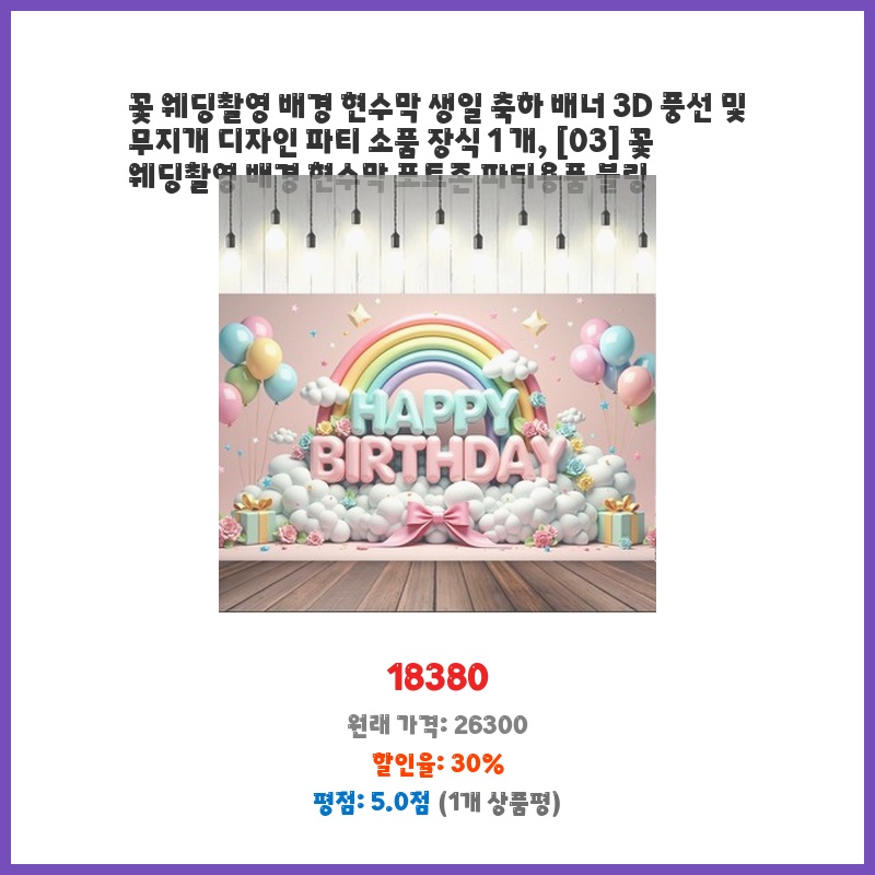 웨딩 촬영을 위한 예쁜 배경이 필요했는데, 꽃과 무지개 디자인이 마음에 들었어요. 3D 풍선까지 포함되어 있어서 따로 준비할 필요 없이 편리할 것 같아 구매했습니다. 가격 대비 구성이 알차 보였습니다.