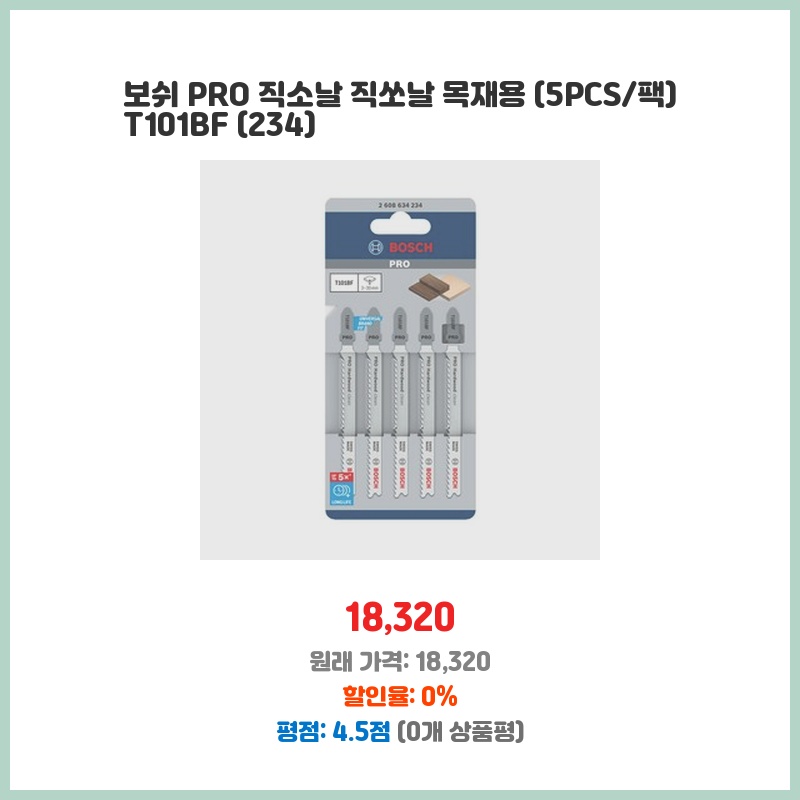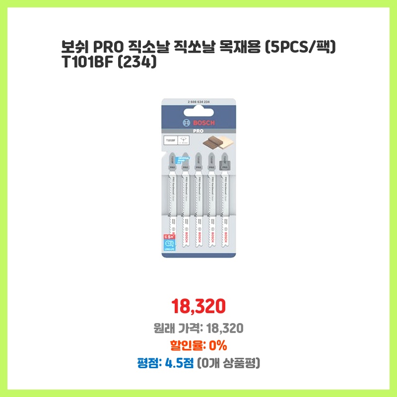 보쉬라는 믿을 수 있는 브랜드의 직소날이라 품질이 좋을 것 같아 구매했습니다. 목재 작업이 잦아 내구성이 좋은 제품을 찾았고, 5개들이라 가성비도 괜찮아 보였습니다. T101BF는 목재용으로 특화되어 있다는 점도 마음에 들었습니다.