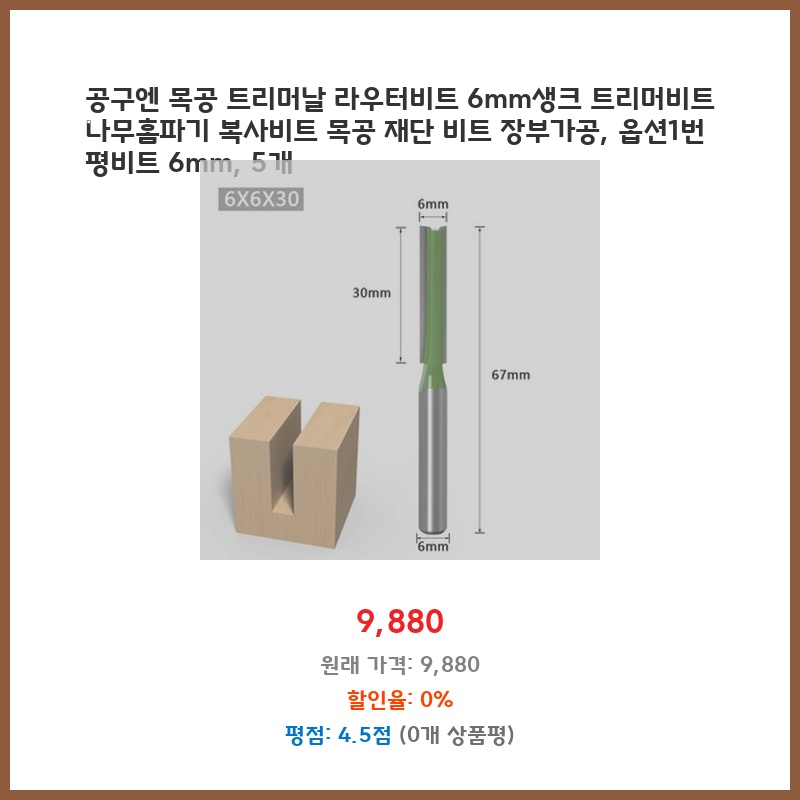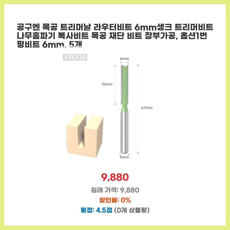 목공 작업을 위한 다양한 홈파기 작업이 필요해서 구매했습니다. 6mm 생크는 제가 가지고 있는 트리머와 호환이 되어 편리하고, 5개 세트라 여러 작업에 활용할 수 있어 경제적입니다. 평비트라 작업이 깔끔하게 마무리되어 만족스럽습니다.