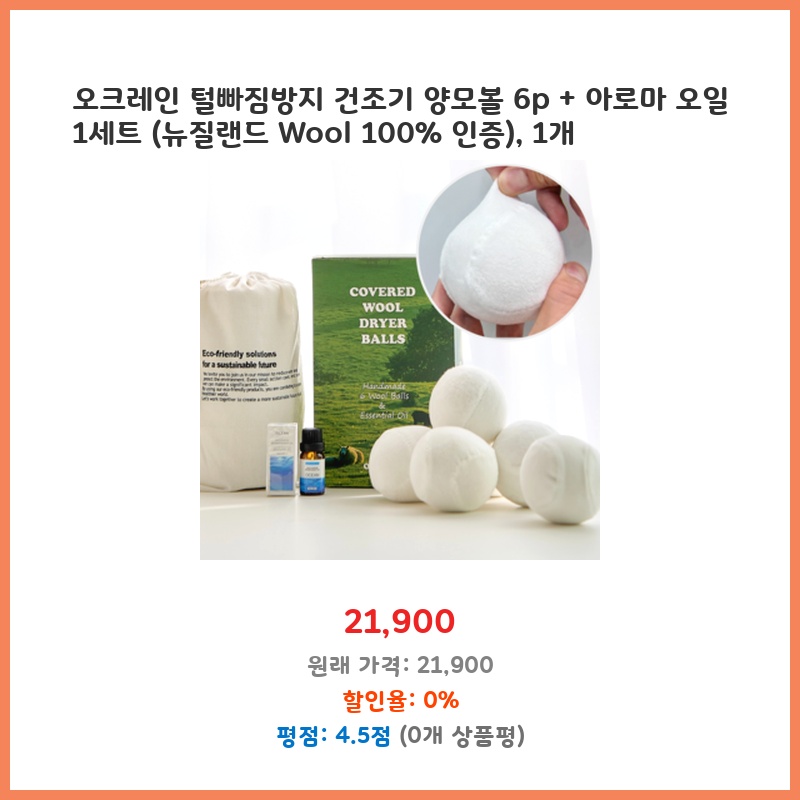 건조기 사용 후 옷에 붙는 섬유 먼지가 신경 쓰였습니다. 뉴질랜드산 양모 100 인증에 털빠짐 방지 효과가 있다는 설명에 구매했습니다. 아로마 오일까지 포함되어 있어 향긋한 빨래를 기대하며 선택했습니다.
