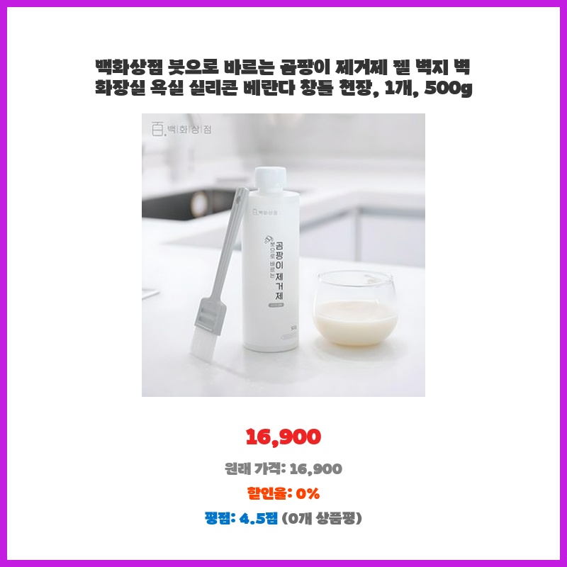 곰팡이 때문에 고민이었는데, 붓으로 바르는 젤 타입이라 좁은 틈새에도 사용하기 편할 것 같아 구매했습니다. 500g 용량이라 넓은 면적에도 충분할 것 같고, 벽지, 실리콘 등 다양한 곳에 사용 가능하다는 점이 좋았습니다.