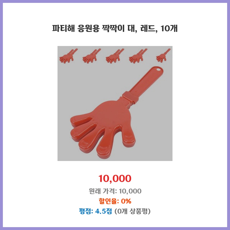 10개의 짝짝이 응원 대가 있어 여러 사람과 함께 응원할 수 있어서 구매했습니다. 빨간색이라 시선을 확 끌고, 가격도 적당해서 부담 없었습니다. 튼튼해 보여 오래 쓸 수 있을 것 같습니다.