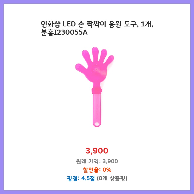 가볍고 휴대성이 좋아 야외 응원에도 편리합니다. LED 빛이 밝고 선명하여 멀리서도 잘 보여 만족스러워요. 분홍색이 예뻐서 더욱 즐겁게 응원할 수 있을 것 같습니다. 짝짝이 디자인이 독특하고 눈에 띄네요.