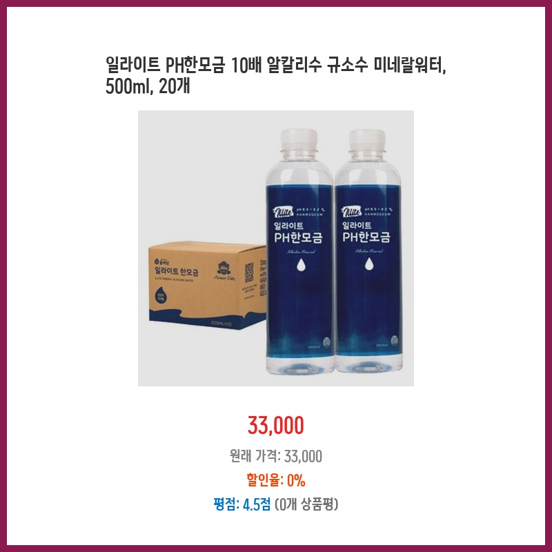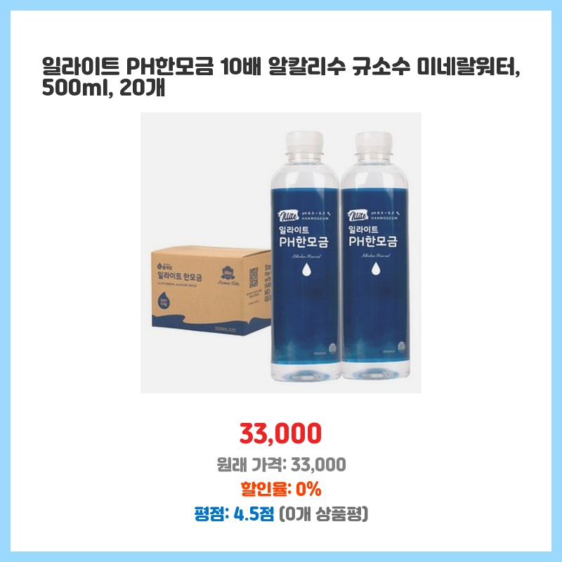 물 섭취량을 늘리고 싶었고, 알칼리수와 규소의 효능에 관심이 있어 구매했습니다. 일일 섭취량이 부담없는 500ml 용량에 20개입이라 편리할 것 같았습니다. 일라이트 함유도 매력적이었습니다.