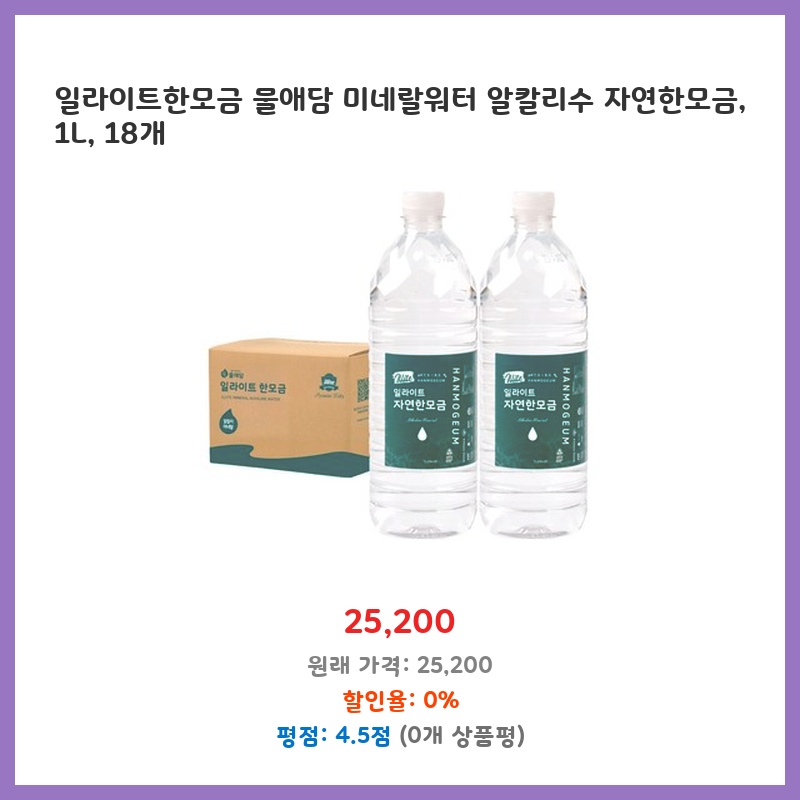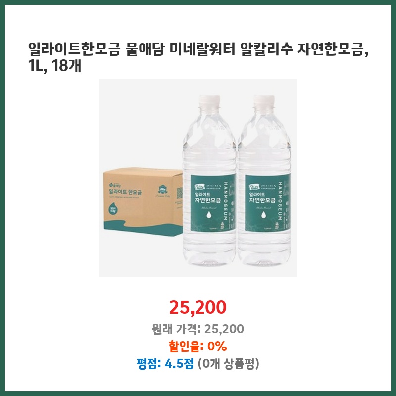 물을 많이 마시려고 노력하는데, 1L 용량에 알칼리수라 건강에도 좋을 것 같아 구매했습니다. 18개들이라 한번에 많이 사서 꾸준히 마실 수 있는 점도 좋았습니다. 일라이트 함유도 매력적이었습니다.