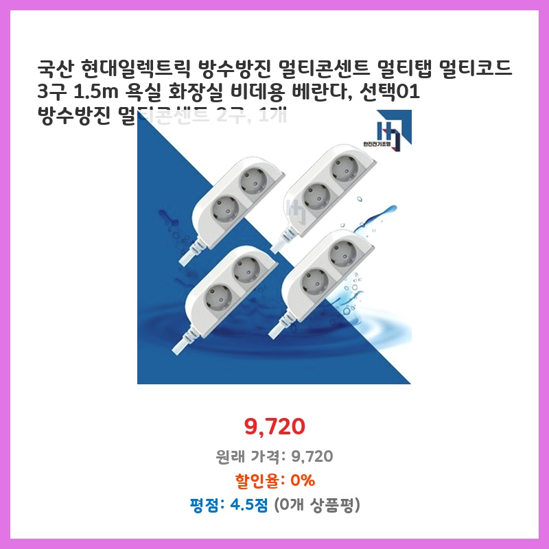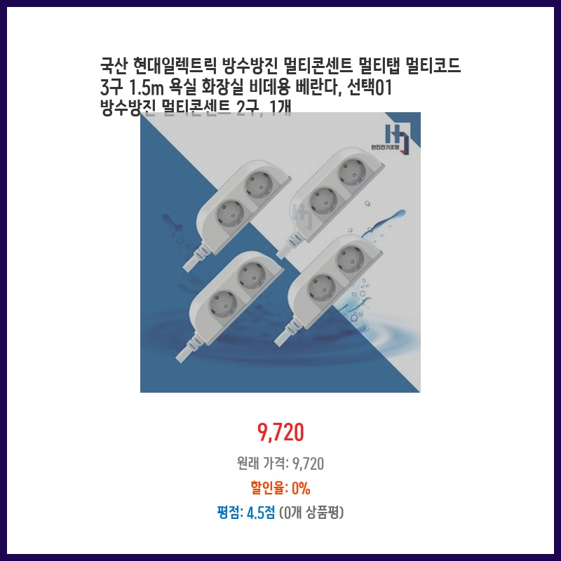국산 현대일렉트릭 방수방진 멀티콘센트 멀티탭 멀티코드 3구 1.5m 욕실 화장실 비데용 베란다, 선택01 방수방진 멀티콘센트 2구, 1개