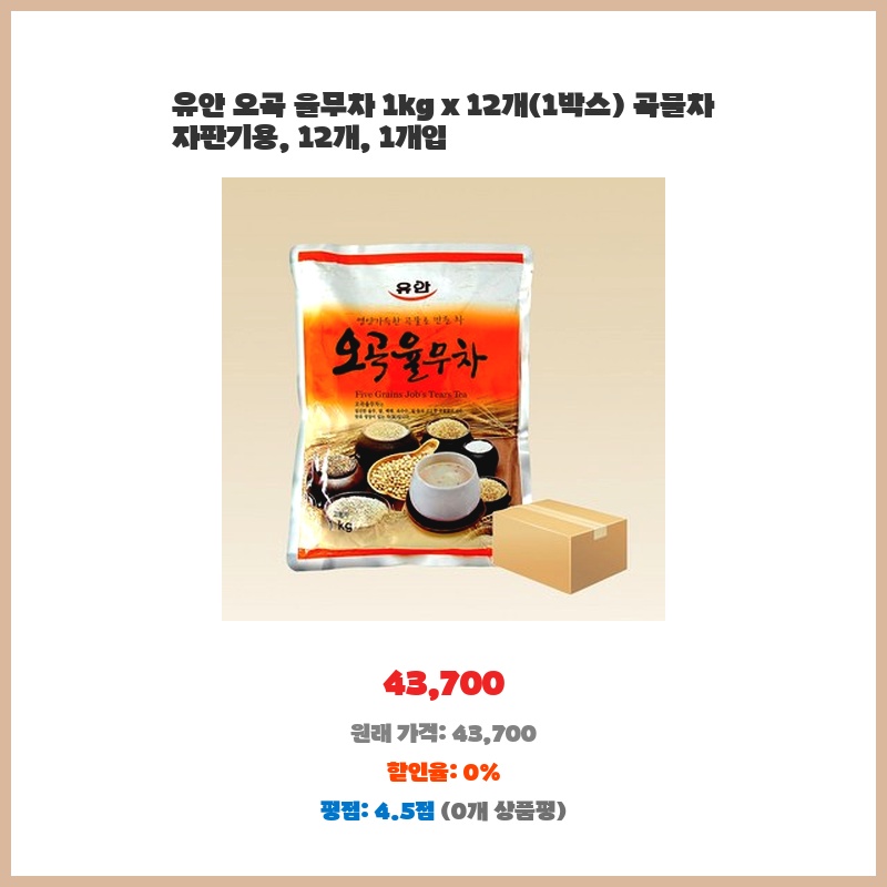 곡물차 자판기에 사용할 율무차를 찾던 중, 대용량에 가격도 적당해서 구매했습니다. 1kg씩 개별 포장되어 위생적이고, 12개들이라 오래 사용할 수 있어 편리할 것 같습니다. 유안 브랜드 제품이라 믿음이 갔습니다.