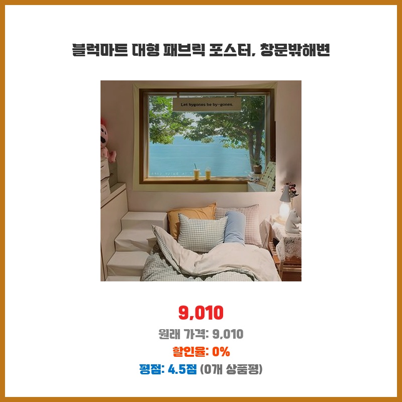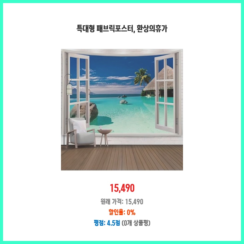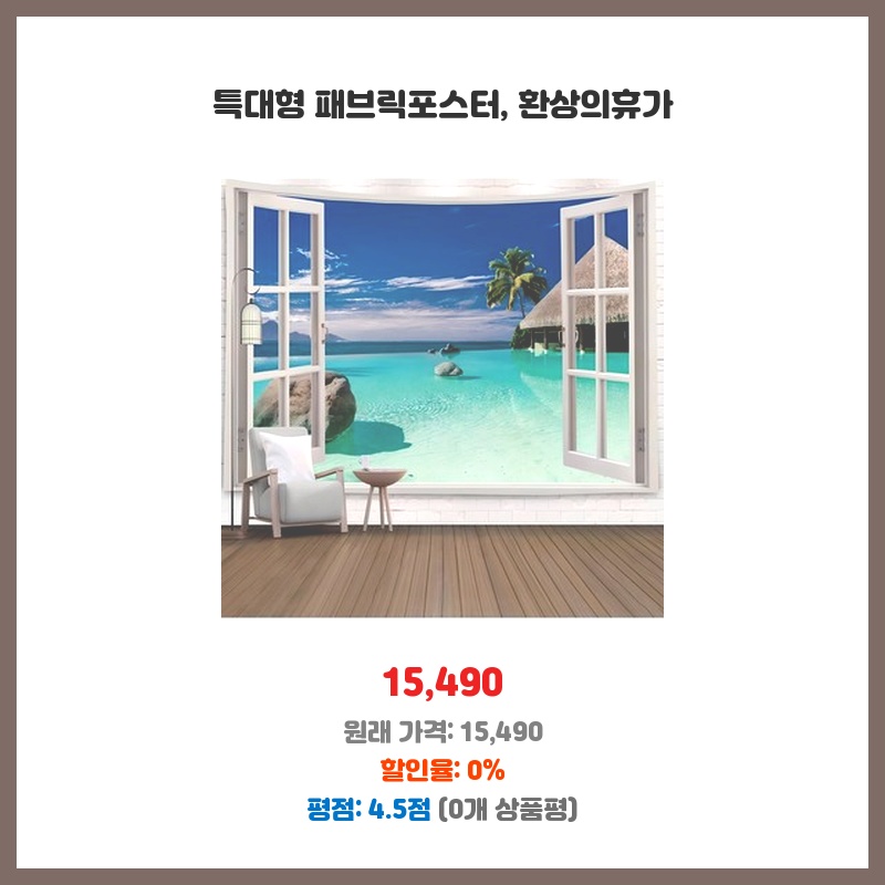 밋밋한 벽면이 신경쓰여 포스터를 찾던 중, 큼직한 사이즈와 시원한 해변 사진이 마음에 들어 구매했습니다. 패브릭 소재라 얇고 가볍지만, 생각보다 튼튼하고 인쇄 품질도 좋습니다. 가격 대비 만족스러워요.