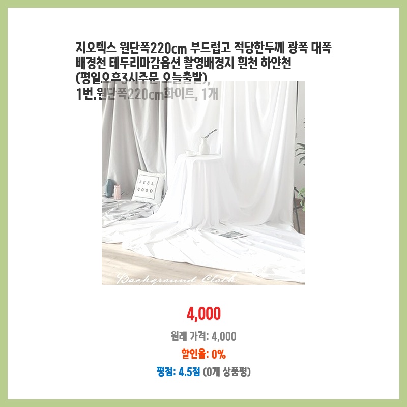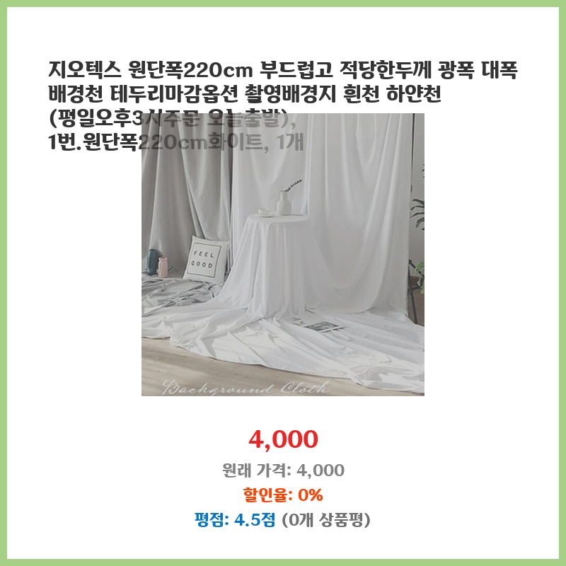 220cm 광폭의 흰 배경천이 필요했는데, 적당한 두께에 부드러운 재질이라 촬영에 좋을 것 같아 구매했습니다. 테두리 마감 옵션도 있어서 더욱 깔끔하게 사용할 수 있을 것 같습니다. 평일 오후 3시 이전 주문 시 당일 출발도 매력적이었습니다.