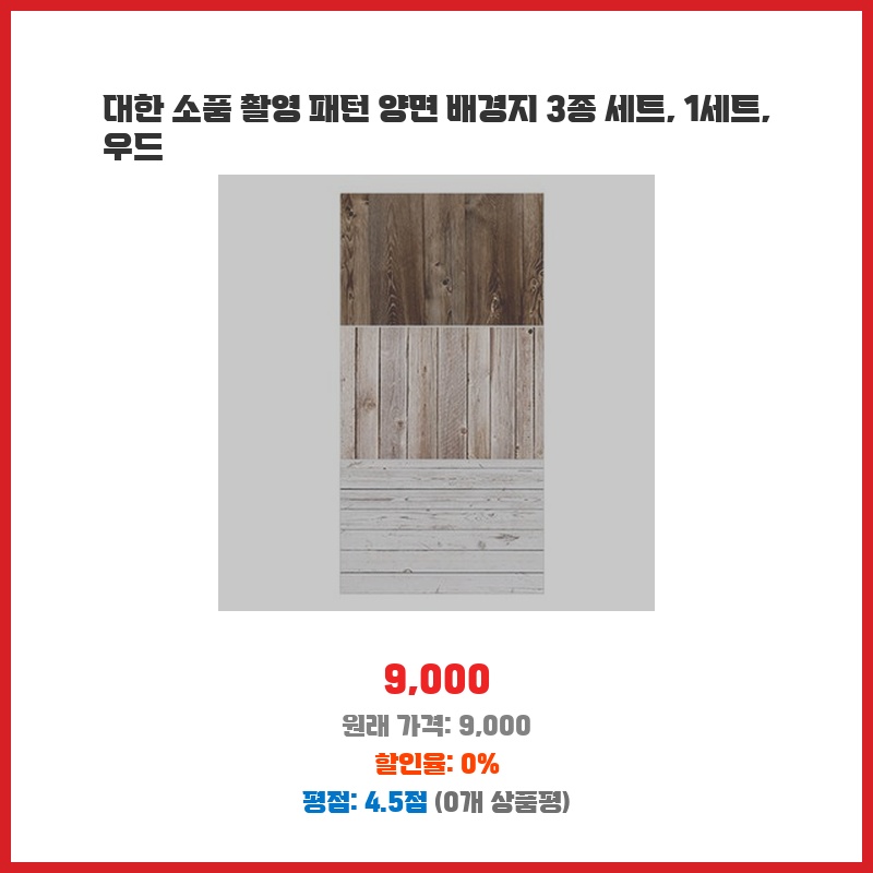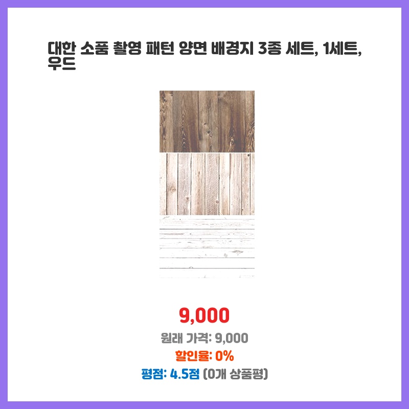 소품 촬영을 위한 다양한 배경이 필요했는데, 3종 세트에 우드 패턴이라 활용도가 높을 것 같아 구매했습니다. 양면이라 더욱 경제적이고, 가격 대비 품질도 괜찮아 보였습니다. 깔끔한 디자인도 마음에 들었습니다.