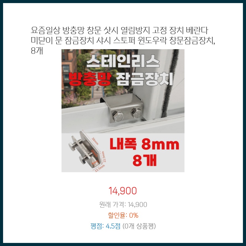 아이가 있어 창문 안전이 걱정이었는데, 간편하게 설치하고 사용할 수 있는 샷시 잠금장치를 찾았습니다. 8개나 들어있어서 집안 곳곳에 설치했고, 미닫이 문에도 잘 맞아 안심이 됩니다. 튼튼하고 깔끔한 디자인도 마음에 듭니다.