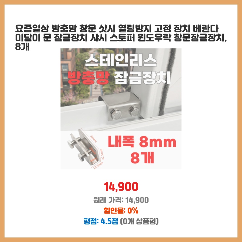 아이가 창문을 열어 위험할까 봐 걱정이었는데, 간편하게 설치하고 안전하게 창문을 고정할 수 있어서 구매했습니다. 저렴한 가격에 효과도 좋아 만족스럽습니다. 미닫이문에도 사용 가능해서 더욱 좋았어요.