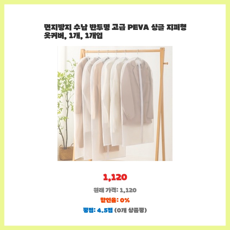 옷장이 좁고 옷 관리가 어려워서 옷 커버를 찾던 중, 반투명 소재라 옷을 꺼내지 않고도 내용물 확인이 가능하고, 지퍼형이라 먼지 유입을 방지해 깔끔하게 보관할 수 있어 5개 세트로 구매했습니다. 가격 대비 품질도 만족스러워 보였습니다.