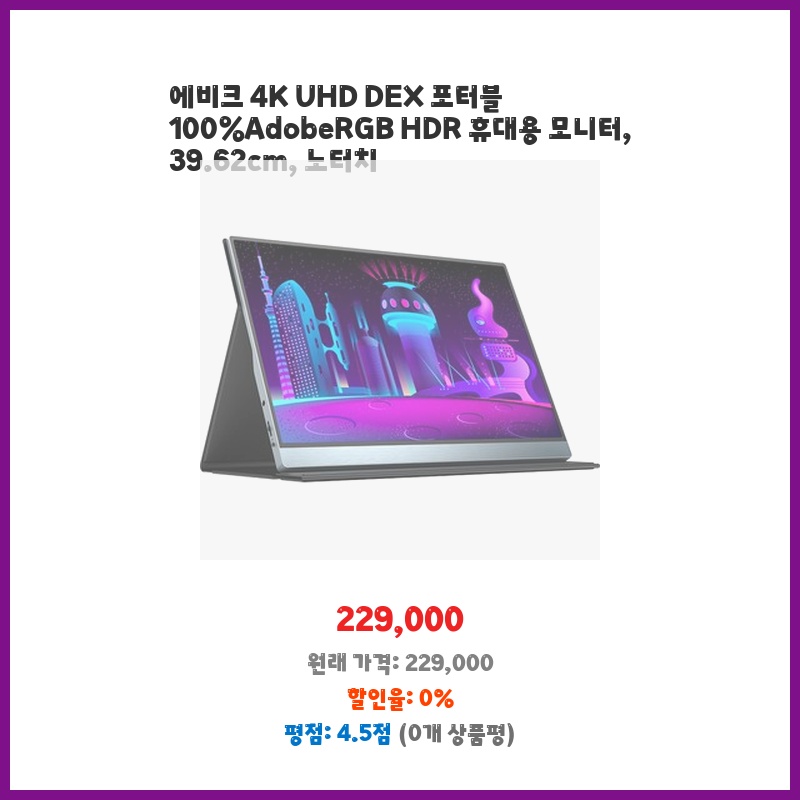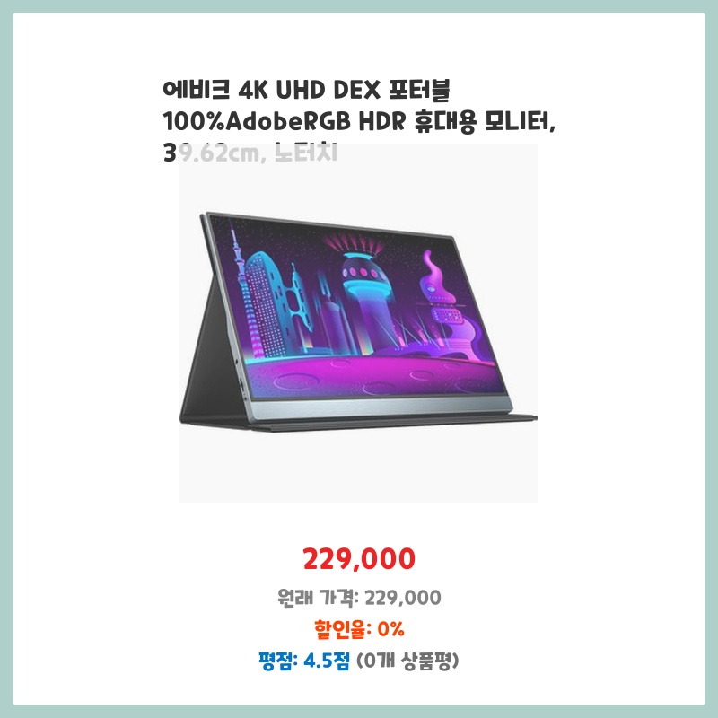 휴대성과 화질이 뛰어난 휴대용 모니터가 필요했습니다. 4K UHD 해상도와 100 Adobe RGB 색영역 지원으로 선명하고 정확한 색감 표현이 만족스럽습니다. 휴대하기 편리한 크기와 노터치 방식도 장점입니다.