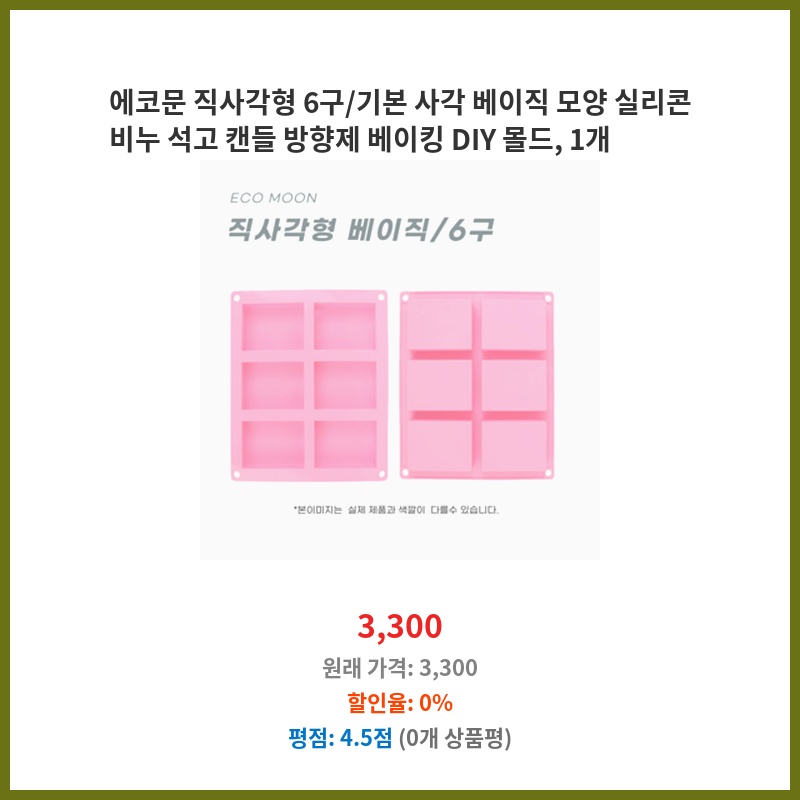 에코문 직사각형 6구/기본 사각 베이직 모양 실리콘 비누 석고 캔들 방향제 베이킹 DIY 몰드, 1개