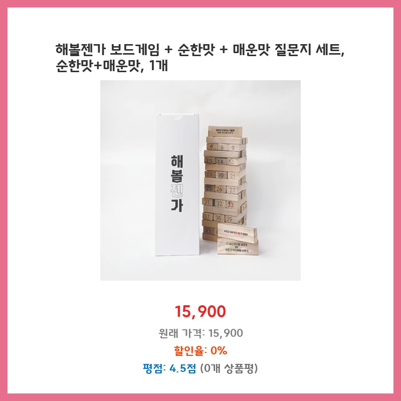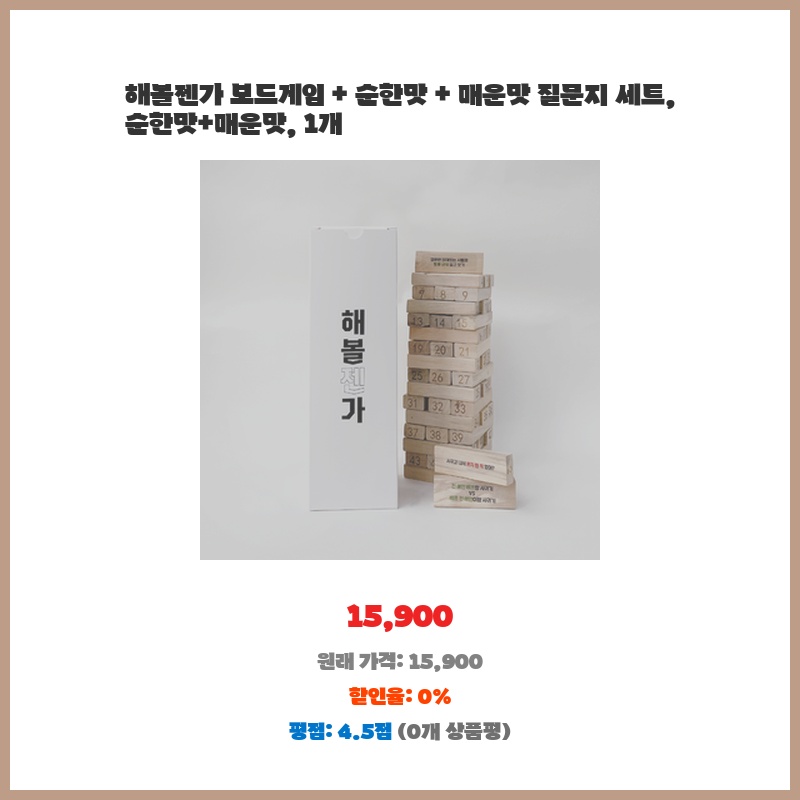 친구들과 색다른 파티 게임을 찾던 중 해볼젠가를 발견했습니다. 순한맛과 매운맛 질문지가 함께라 다양한 분위기를 연출할 수 있고, 질문 수준도 적절해서 재밌게 즐길 수 있을 것 같아 구매했습니다.