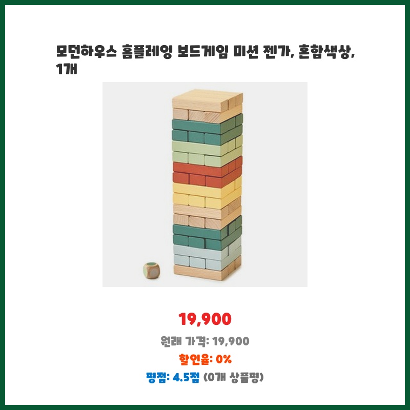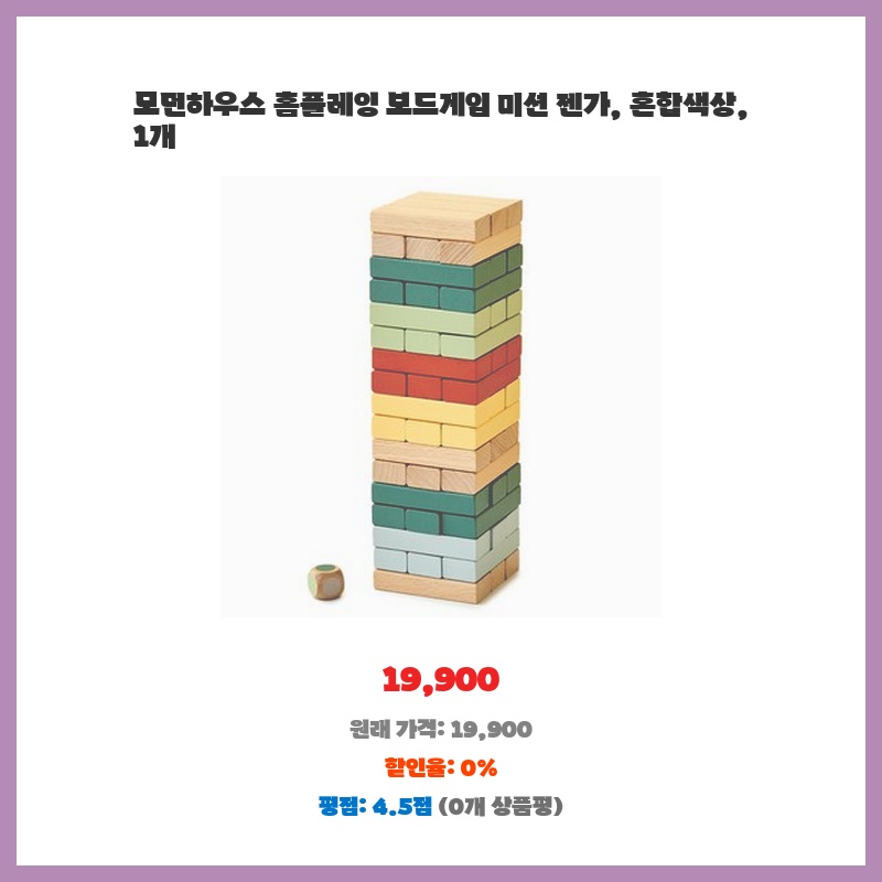 평소 젠가를 좋아해서 새로운 변형 게임을 찾던 중 모던하우스 홈플레잉 보드게임 미션 젠가를 발견했습니다. 미션 카드가 추가되어 기존 젠가보다 더욱 다양하고 재미있는 플레이가 가능할 것 같아 구매했습니다. 깔끔한 디자인도 마음에 들었습니다.