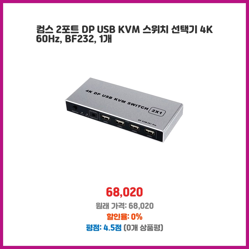 두 대의 PC를 하나의 모니터, 키보드, 마우스로 간편하게 전환하고 싶었습니다. 4K 60Hz 지원으로 고해상도 영상 작업에도 문제없고, USB 연결 지원으로 편리성이 높아 구매했습니다. DP 포트 지원도 장점입니다.