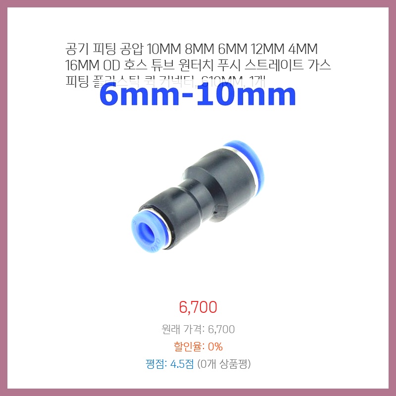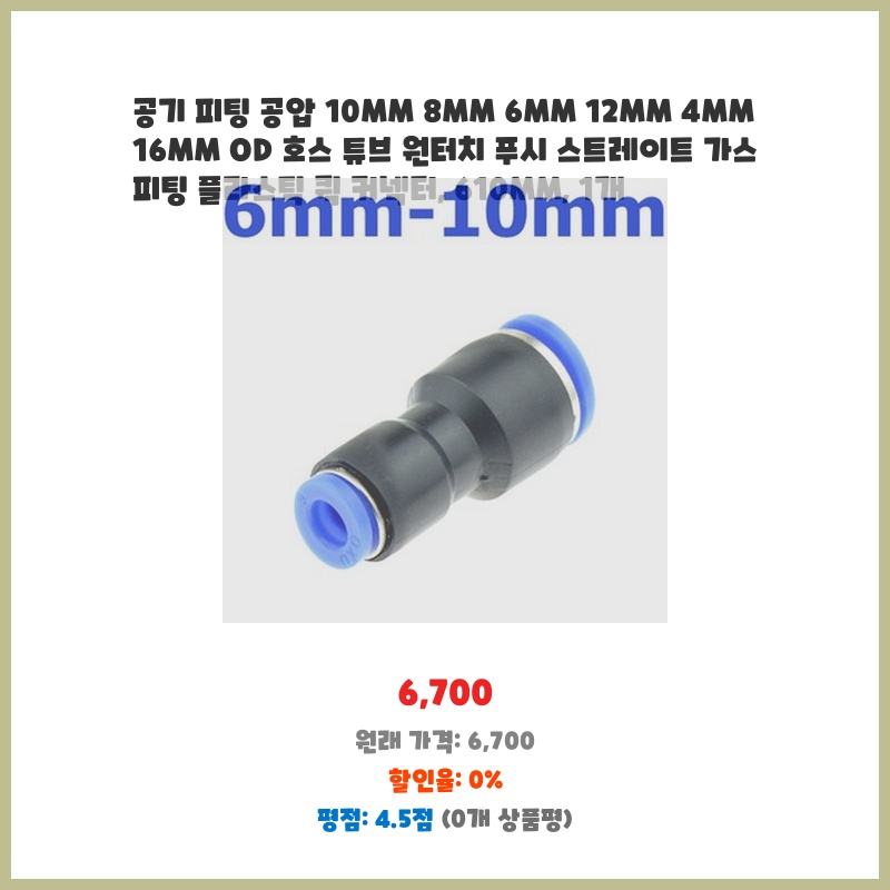 공압 시스템 작업을 위해 다양한 사이즈의 호스 연결이 필요했는데, 이 제품은 4mm부터 16mm까지 다양한 사이즈를 지원하여 편리하게 사용할 수 있었습니다. 원터치 방식이라 연결과 분리가 간편하고, 플라스틱 소재라 가볍고 내구성도 좋아 보입니다.