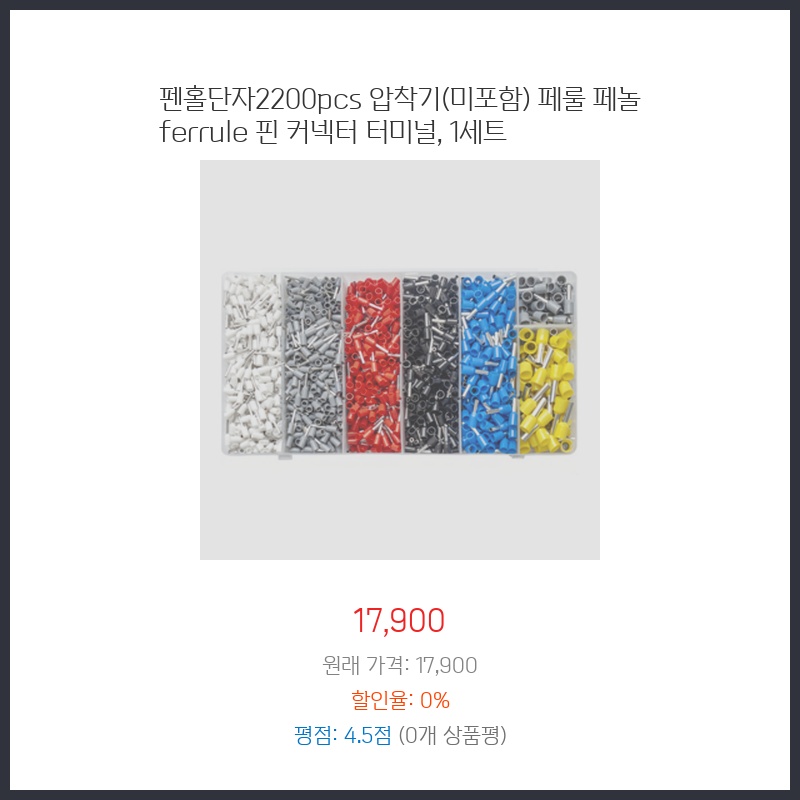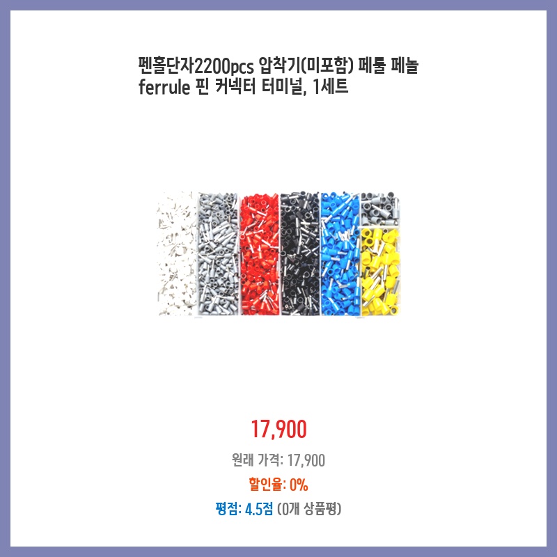 2200개의 펜홀단자가 한 세트로 저렴하게 제공되어 프로젝트에 필요한 수량을 확보하기에 좋습니다. 페룰 핀 커넥터 터미널이 필요한 작업에 경제적인 선택이 될 것 같아 구매했습니다. 압착기는 따로 준비해야 하는 점은 알고 있습니다.