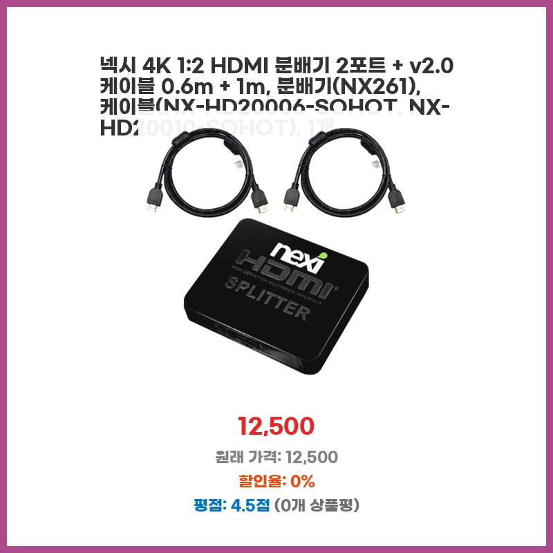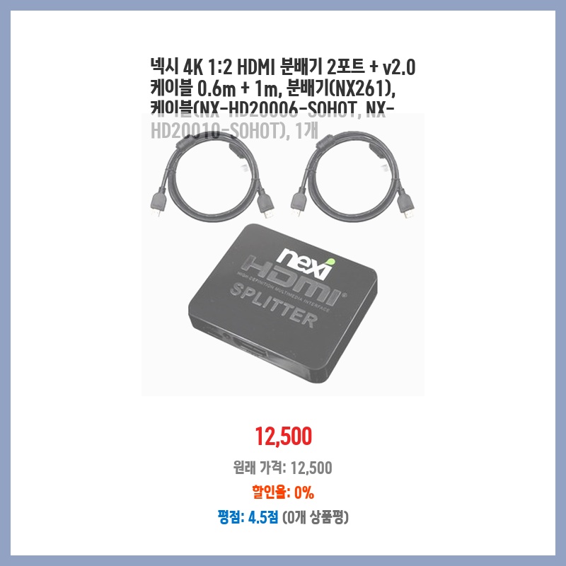 넥시 4K 1:2 HDMI 분배기 2포트 + v2.0 케이블 0.6m + 1m, 분배기(NX261), 케이블(NX-HD20006-SOHOT, NX-HD20010-SOHOT), 1개