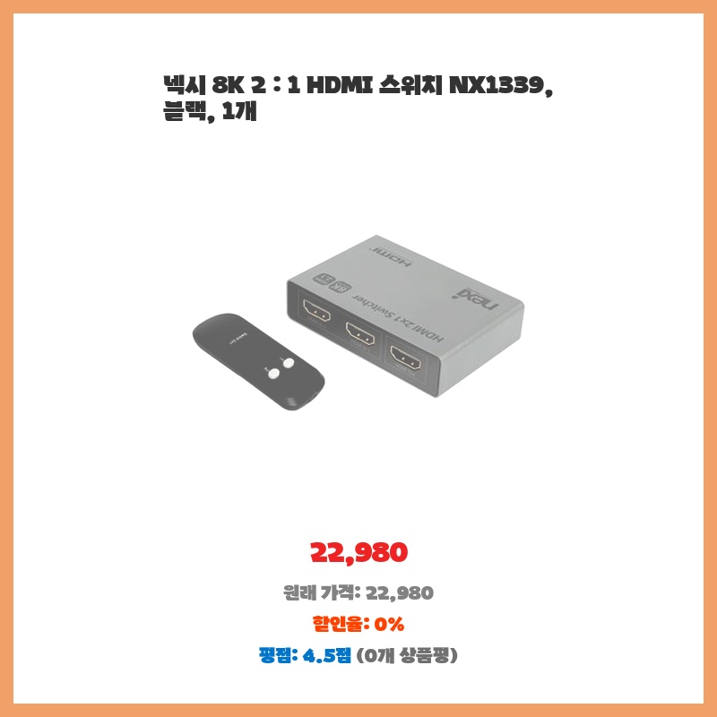 4K TV 두 대를 번갈아 사용하는데, HDMI 단자가 부족하여 구매했습니다. 간편한 21 스위치로 설치도 쉽고, 8K 지원으로 미래에도 활용 가능할 것 같아 만족스럽습니다. 가격 대비 성능이 좋습니다.