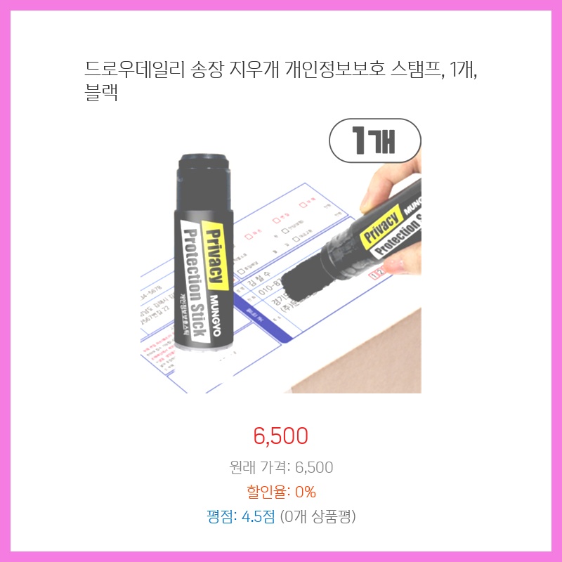 개인정보 보호가 중요해져서 송장 정보를 안전하게 가릴 수 있는 스탬프가 필요했습니다. 드로우데일리 제품은 디자인도 깔끔하고, 지우개 기능까지 있어 실용적이라 구매했습니다. 잉크 번짐 없이 깔끔하게 가려지는 점이 특히 좋습니다.