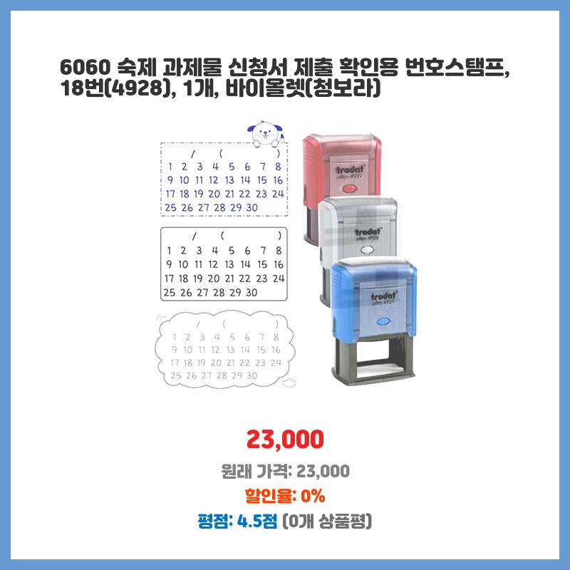 숙제 과제물 제출 확인 업무의 효율성을 높이기 위해 번호스탬프가 필요했습니다. 깔끔한 디자인과 청보라 색상이 마음에 들었고, 18번이라는 숫자가 제출 관리에 편리할 것 같아 구매했습니다. 숫자 크기와 선명도도 중요하게 고려했습니다.