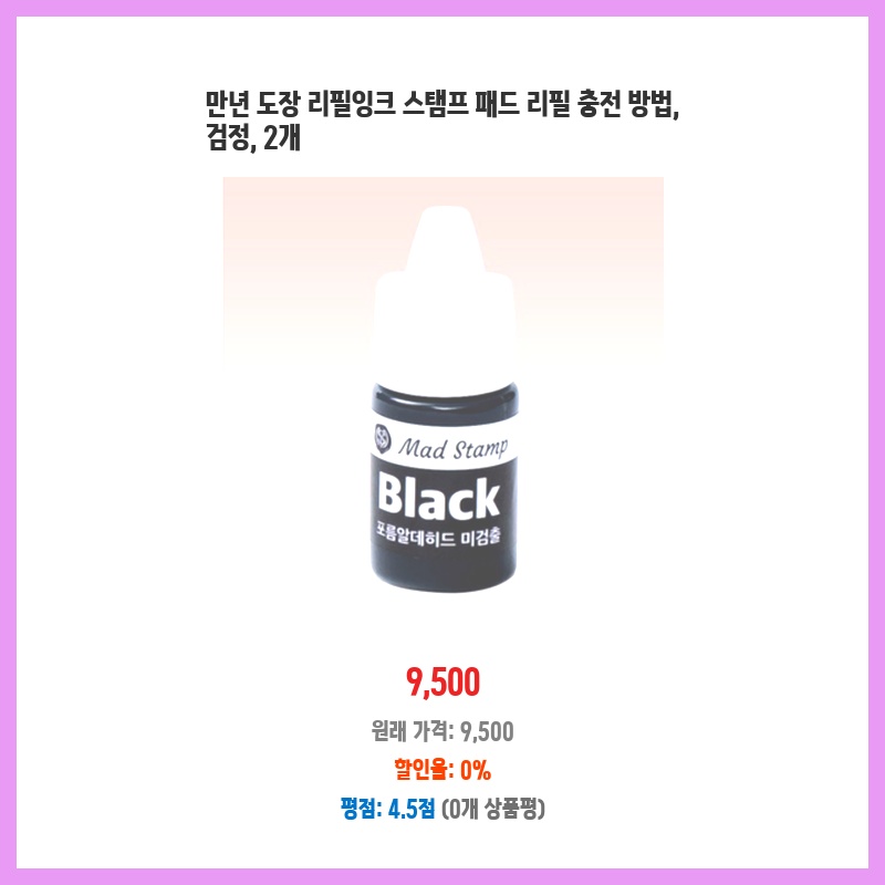 기존 만년도장 잉크가 다 떨어져서 새로 구매했습니다. 2개들이라 오래 쓸 수 있고, 검정색이라 어떤 서류에도 잘 어울립니다. 리필이 간편하다는 후기를 보고 선택했어요. 가격도 적당한 편입니다.