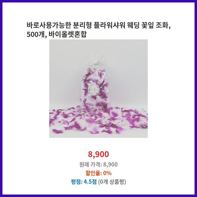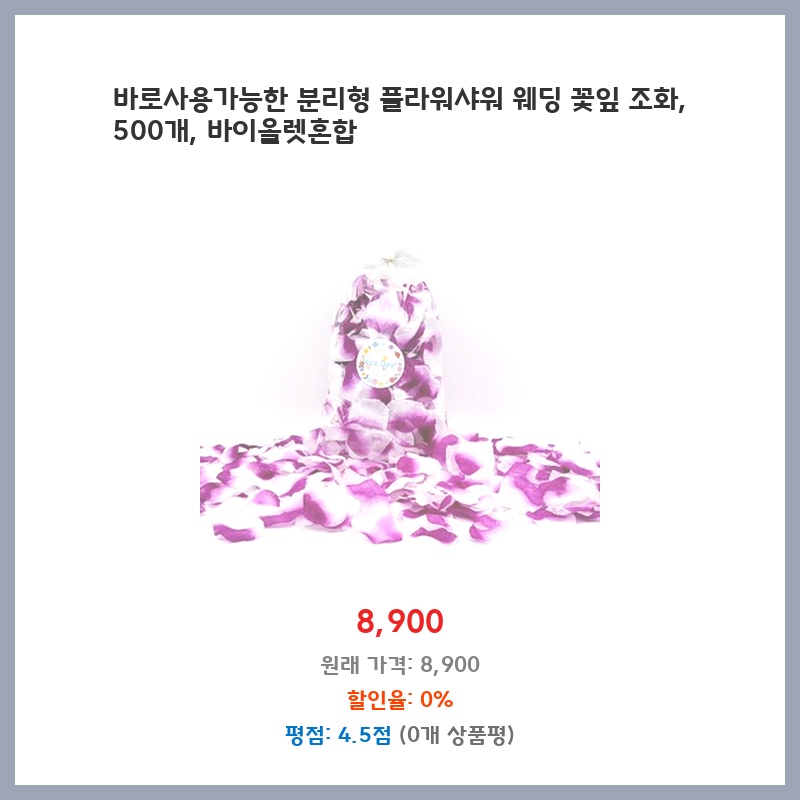 웨딩 촬영 소품으로 꽃잎을 찾던 중, 500개나 들어있고 바로 사용 가능한 분리형이라 편리할 것 같아 구매했습니다. 바이올렛 혼합 색상도 예뻐서 선택했습니다. 합리적인 가격도 마음에 들었어요.