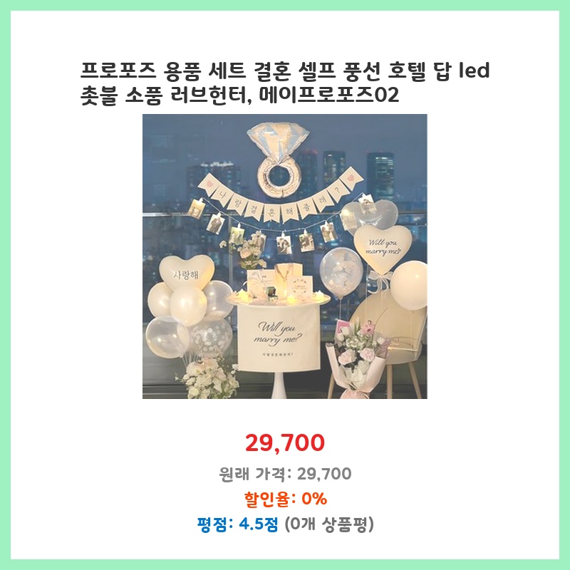 호텔 컨셉의 프로포즈를 계획 중이었는데, 풍선, LED 촛불 등 필요한 소품이 한 세트로 구성되어 편리했습니다. 가격 대비 구성품이 알차고, 셀프로 준비하기에 적합한 수준의 품질이었습니다.