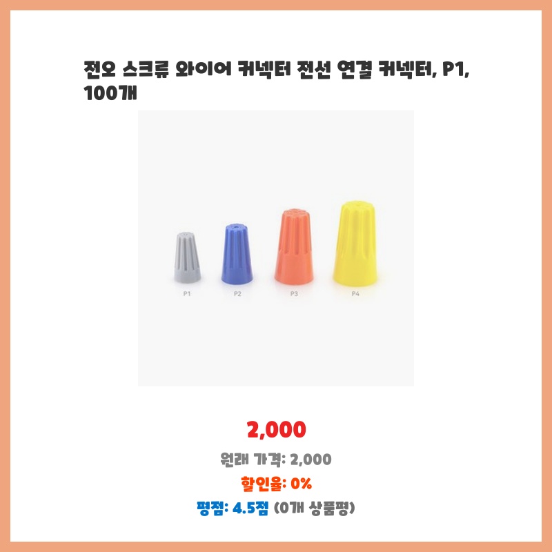 전선 연결 작업이 잦아 효율적인 커넥터가 필요했습니다. 전오 스크류 와이어 커넥터는 견고하고 100개나 들어있어 가성비가 좋습니다. 작업 시간 단축과 안정적인 연결을 기대하며 구매했습니다.