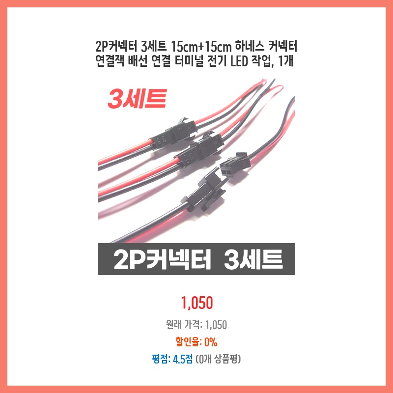 LED 작업을 위한 간편한 배선 연결이 필요했는데, 15cm 길이 두 개의 2P 커넥터가 세트로 저렴하게 제공되어 구매했습니다. 별도의 배선 작업 없이 바로 연결할 수 있어 편리할 것 같았습니다. 세트 구성으로 여러 개 작업에 활용 가능한 점도 좋았습니다.