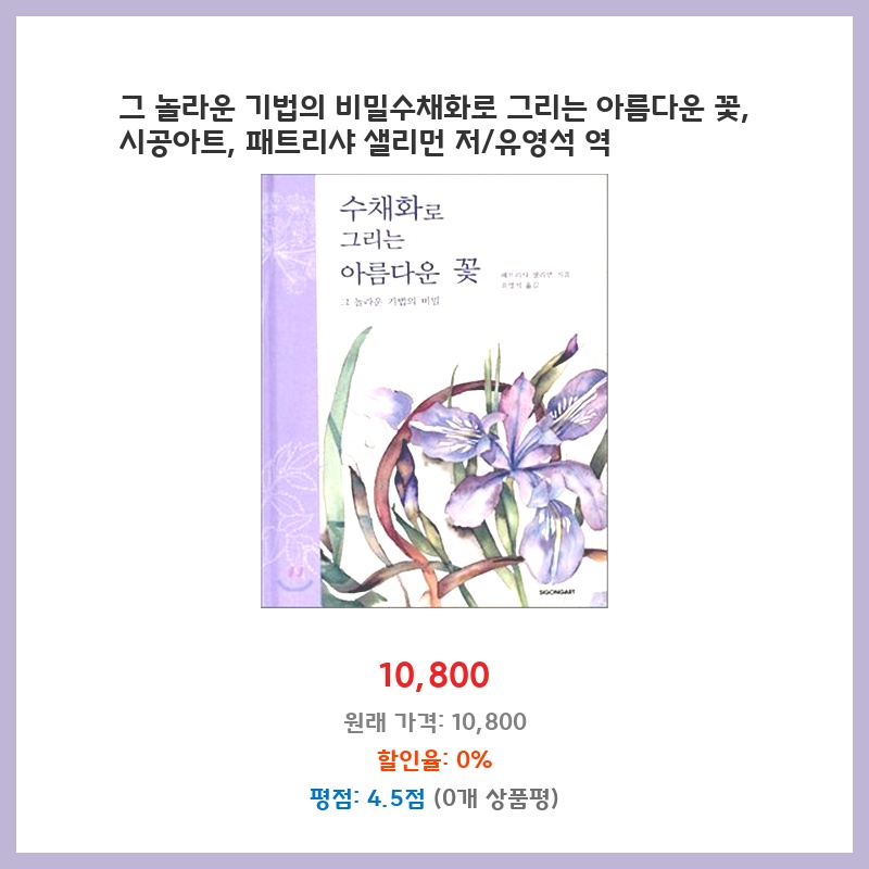 수채화 기법을 배우고 싶었는데, 패트리샤 샐리먼의 명성에 이끌려 구매했습니다. 다양한 꽃 그림과 상세한 설명이 기대됩니다. 책의 구성과 그림 퀄리티가 괜찮다는 평이 많아 기대하고 있습니다.