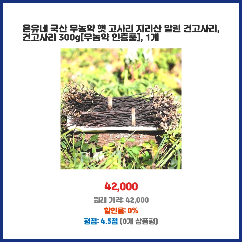 무농약 인증을 받은 국산 고사리라 안심하고 먹일 수 있어 구매했습니다. 지리산에서 자란 햇 고사리라 품질도 좋을 것 같고, 300g이면 우리 가족이 먹기에 충분한 양입니다. 말린 고사리라 보관도 편리할 것 같아요.