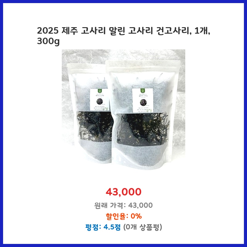 제주산 고사리라 믿을 수 있고, 300g이라는 충분한 양에 품질 좋은 건고사리를 합리적인 가격에 구매할 수 있어 선택했습니다. 말린 고사리라 보관도 용이하고, 필요할 때마다 간편하게 요리에 활용할 수 있습니다.