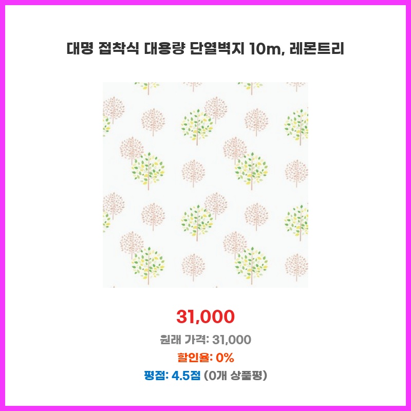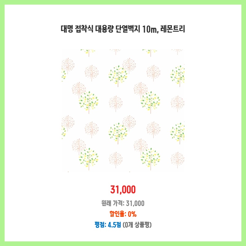 겨울철 냉기 유입이 심해 단열 효과가 좋은 벽지를 찾던 중, 접착식이라 시공이 간편하고 10m 대용량으로 가성비가 좋아 구매했습니다. 레몬트리 디자인도 마음에 들었어요.