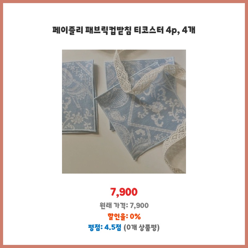 예쁜 페이즐리 무늬 덕분에 테이블이 더욱 화사해졌어요. 컵받침으로서 기능도 좋고, 4개 세트라 부족함 없이 사용하고 있습니다. 만족합니다!