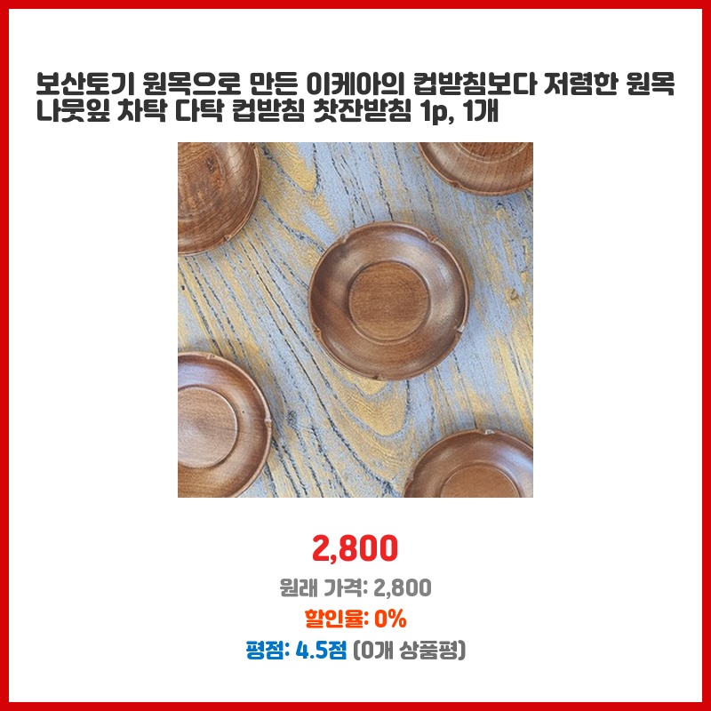 보산토기 원목으로 만든 이케아의 컵받침보다 저렴한 원목 나뭇잎 차탁 다탁 컵받침 찻잔받침 1p, 1개