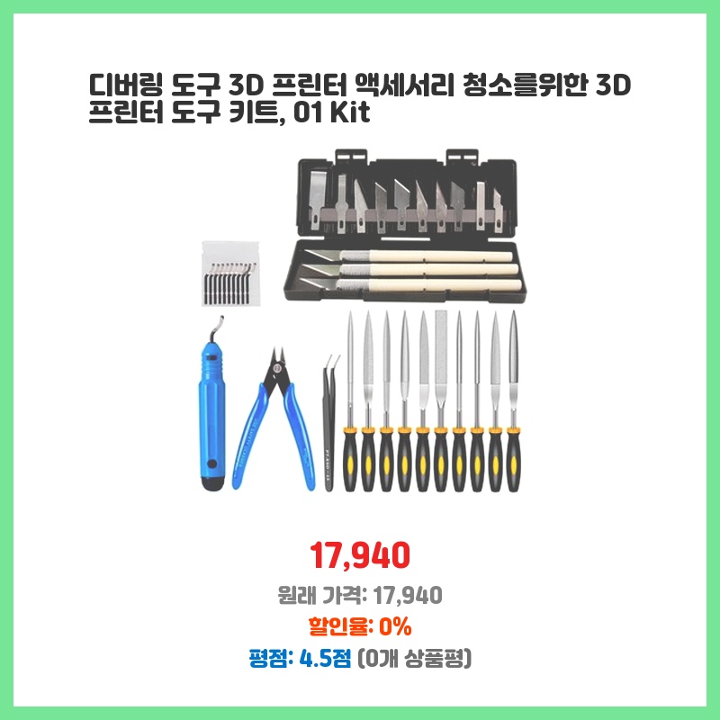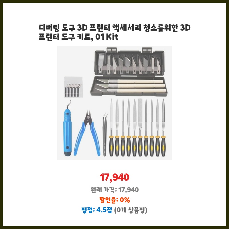 3D 프린팅 후 처리 시간을 단축하고 싶어서 구매했습니다. 다양한 도구가 하나의 키트로 구성되어 편리하고, 세척과 디버링 작업이 효율적으로 이루어져 출력물 품질 향상에 도움이 될 것 같았습니다. 가격 대비 구성품이 알차다는 점도 매력적이었습니다.