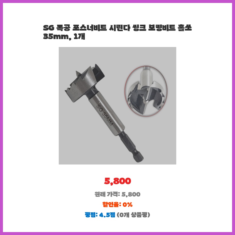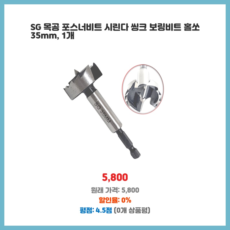 목재 작업을 자주 하는데, 깔끔한 35mm 구멍을 뚫어야 할 일이 많았습니다. SG 포스너비트는 튼튼하고 정확도가 높다는 평이 많아 구매했습니다. 가격 대비 성능이 좋아 만족스러웠습니다.