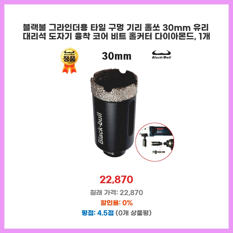 블랙불 홀쏘는 다이아몬드 코어 비트라 타일, 유리, 대리석 등 단단한 재질의 정밀한 작업에 적합해 보였습니다. 30mm 사이즈도 제가 필요한 크기였고, 깔끔한 절삭면을 기대하며 구매했습니다.