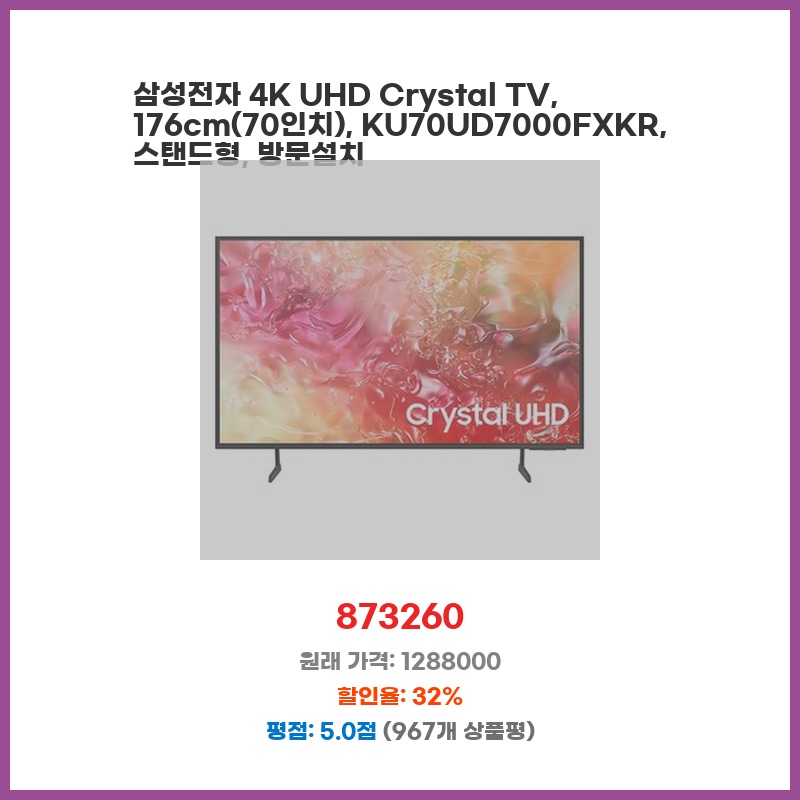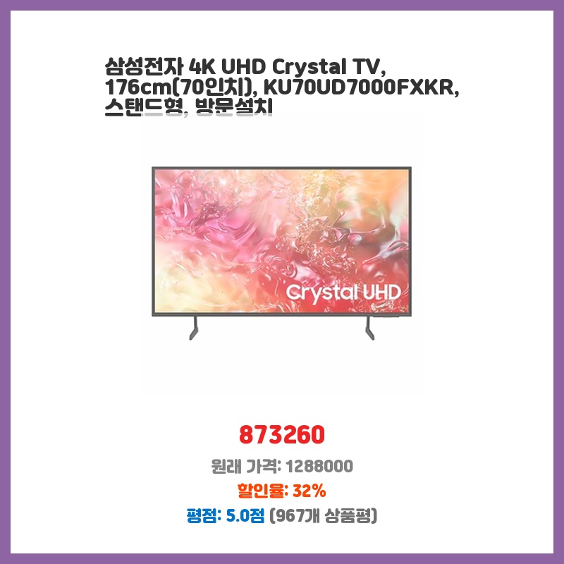 70인치 대화면에 4K UHD 화질이라 영화 감상이 훨씬 몰입감 있을 것 같아 구매했습니다. 크리스탈 프로세서도 탑재되어 화질이 선명하고 색감도 좋다는 평이 많아 기대됩니다. 스탠드형이라 설치도 간편할 것 같습니다.