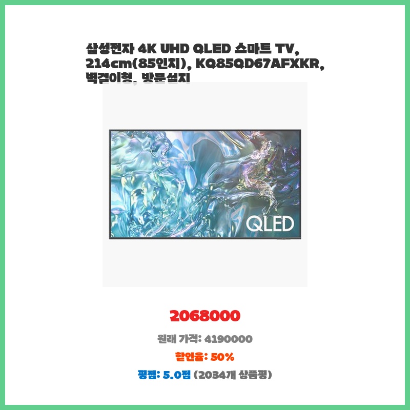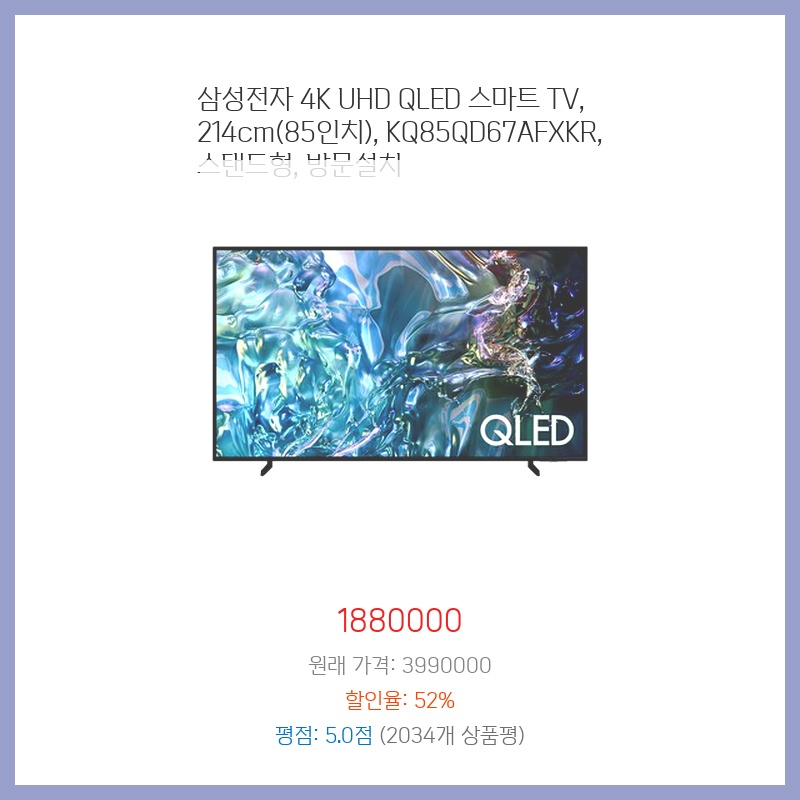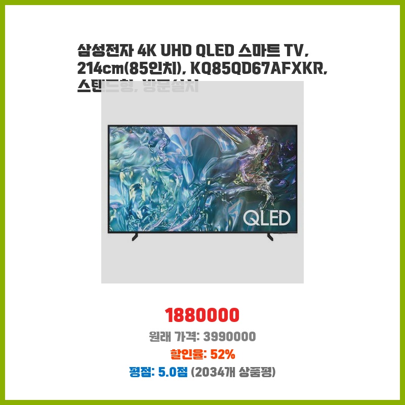 85인치 대화면에 4K UHD 화질과 QLED 기술의 선명한 화질이 마음에 들었습니다. 스마트 기능도 편리하고, 벽걸이 설치로 공간 활용도가 높아져 만족합니다. 방문 설치 서비스도 편리했습니다.
