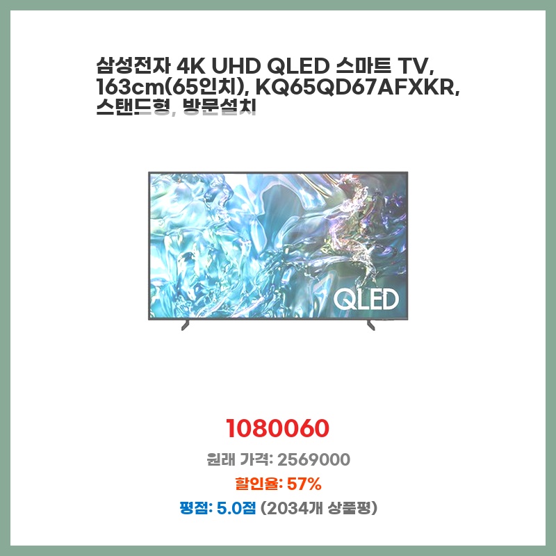 넓은 화면과 선명한 화질의 4K UHD QLED TV가 필요했습니다. 삼성의 기술력을 신뢰하고, 스마트 기능도 편리하게 사용하고 싶어 이 제품을 선택했습니다. 65인치 크기는 거실에 적합하며, 방문 설치 서비스도 편리했습니다.