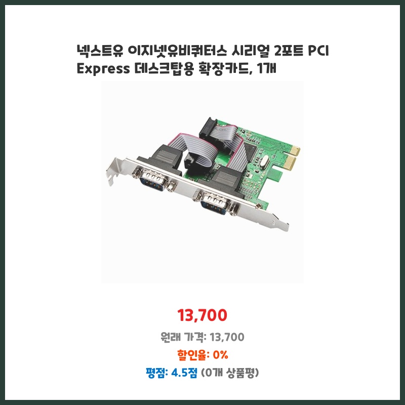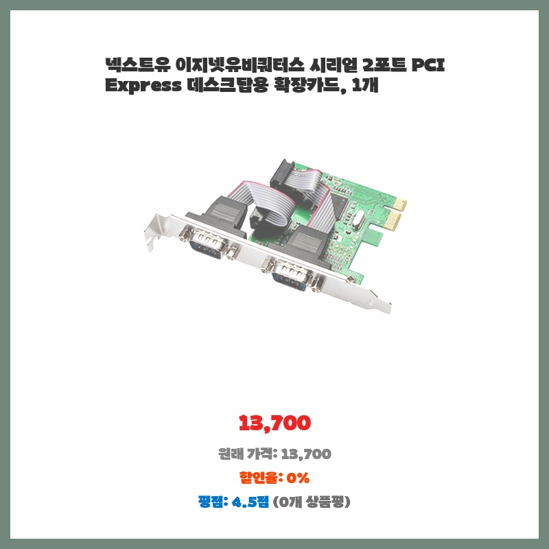 기존 시리얼 포트가 부족하여 추가 포트가 필요했는데, PCI Express 슬롯을 활용할 수 있는 저렴한 제품이라 구매했습니다. 설치도 간편하고 안정적으로 작동하여 만족스럽습니다.