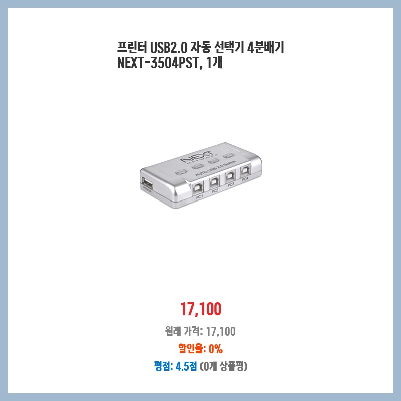 여러 대의 프린터를 사용하는데, 매번 USB를 바꿔 꽂는 번거로움이 커서 구매했습니다. 자동으로 프린터를 선택해주는 기능이 편리하고, 4개의 프린터를 동시에 연결할 수 있어 업무 효율이 향상될 것으로 기대합니다. USB 2.0 지원으로 호환성도 좋습니다.