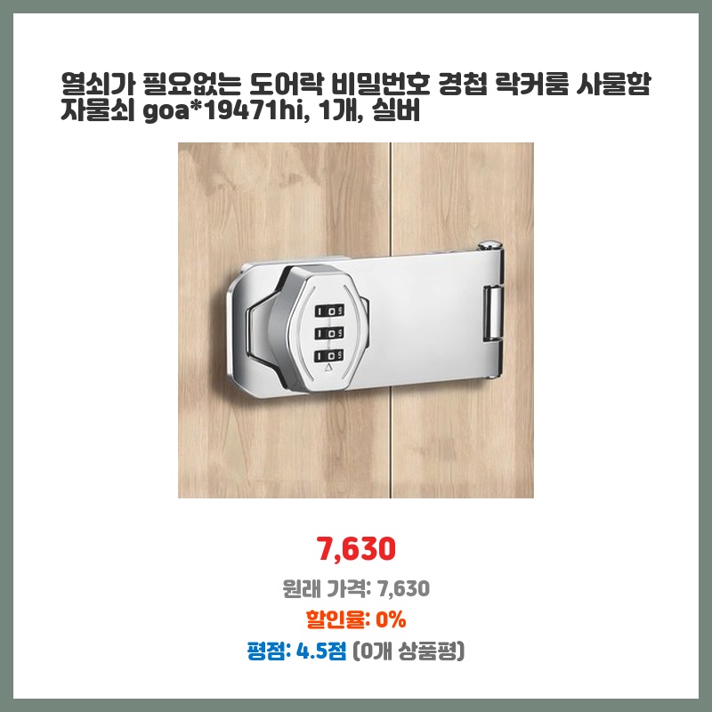 열쇠가 필요없는 도어락 비밀번호 경첩 락커룸 사물함 자물쇠 goa*19471hi, 1개, 실버