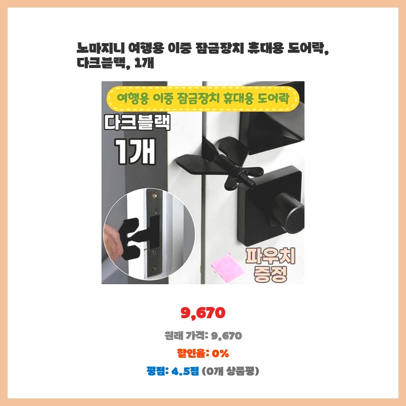 여행 중 숙소 문의 안전이 걱정되어 추가 보안장치를 찾던 중 이중 잠금장치 기능과 휴대성이 좋은 이 제품을 선택했습니다. 다크블랙 색상도 마음에 들었고, 가격도 적당했습니다.