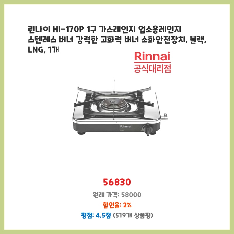 HI-170P 린나이정품 1구가스레인지식당용업소용가정용(가정용사용시가스공급자사용여부확인), LNG